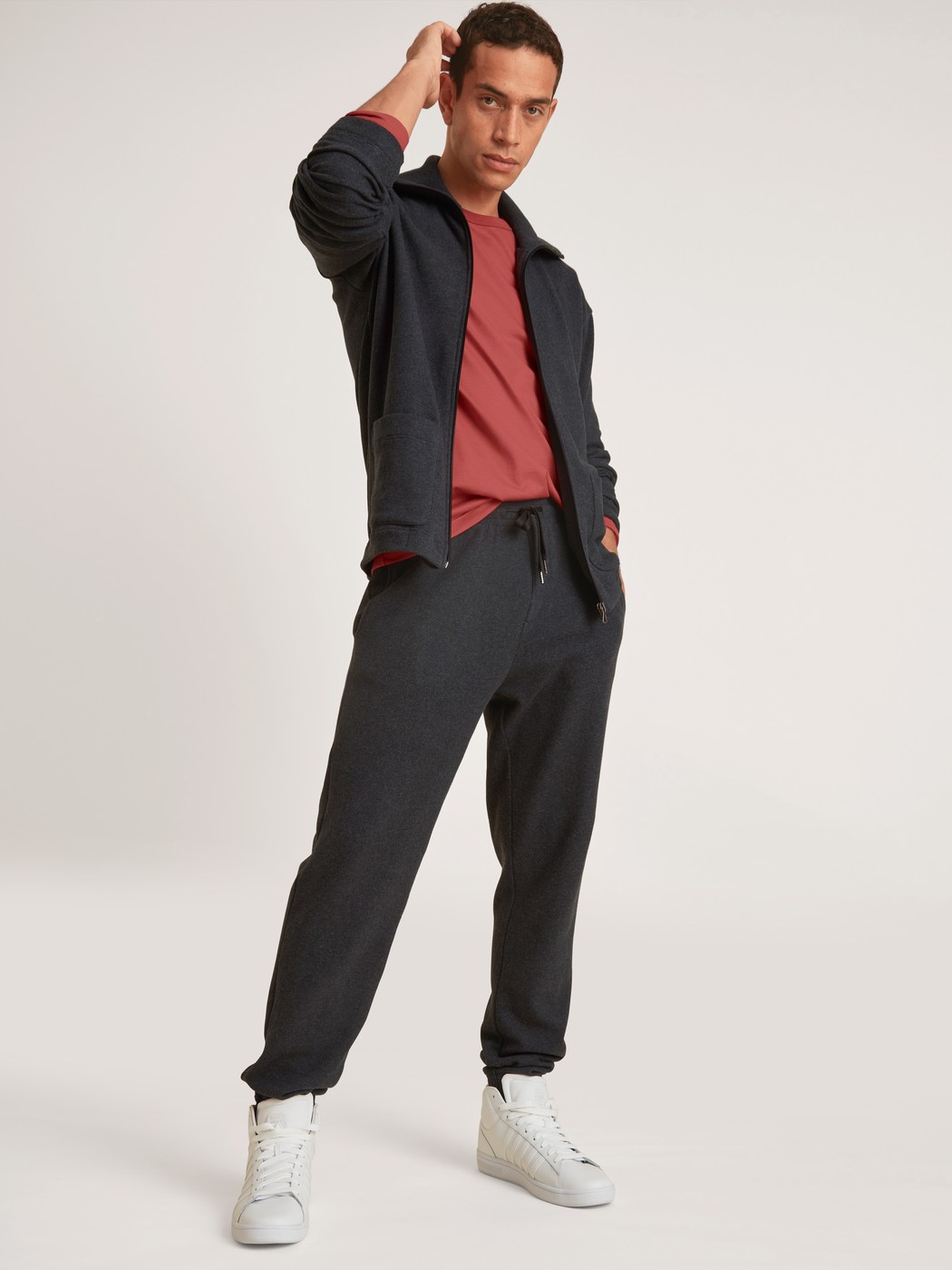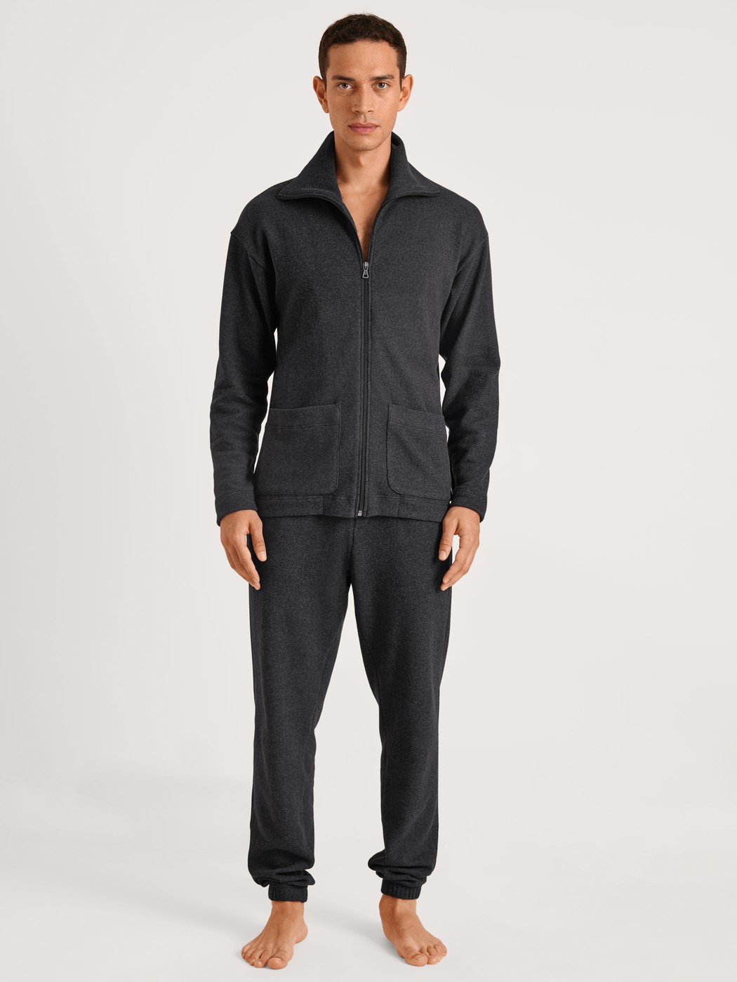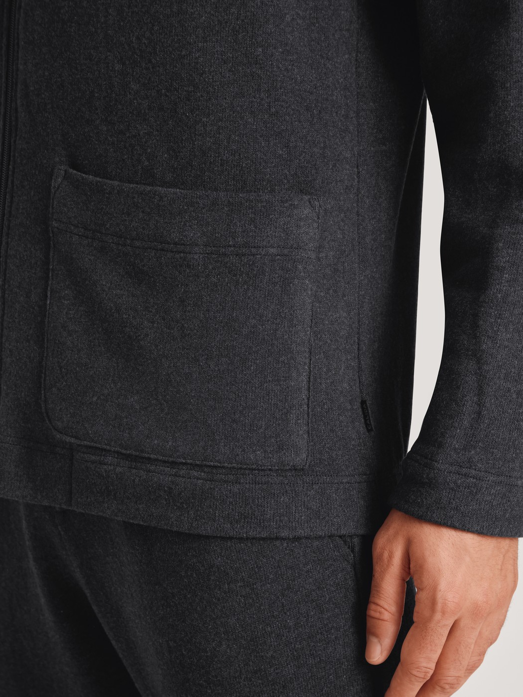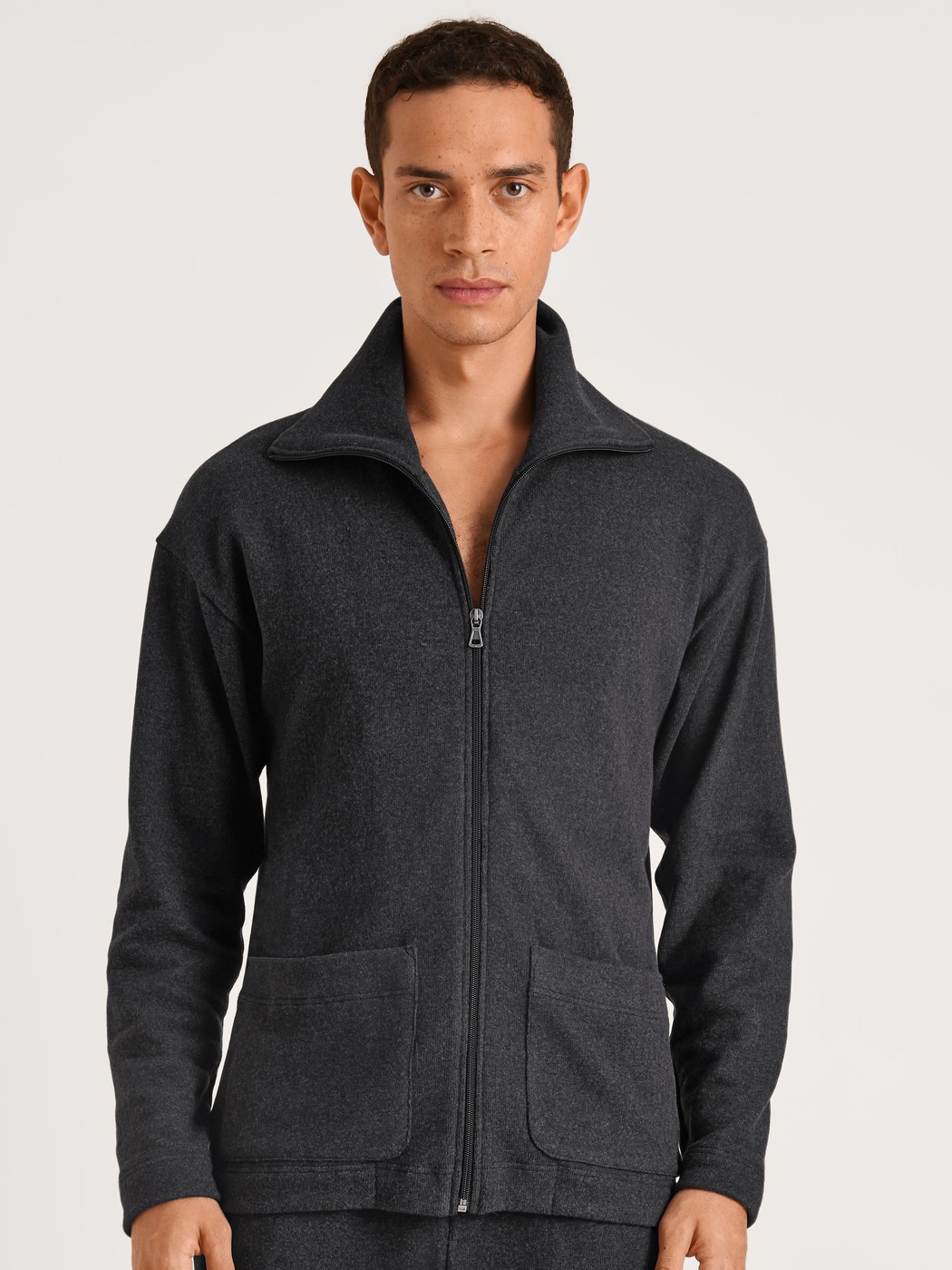 The jacket from the REMIX LOUNGE TIME OFF line from CALIDA doesn’t just guarantee an instant sporty look. Wonderfully soft jersey knit made from melange-look recycled yarn keeps you warm throughout the day, whether you’ve just finished exercising or are lounging on the couch. The large turn-down collar, zipper, patch-style pockets and slight drop shoulders complete the look to perfection.