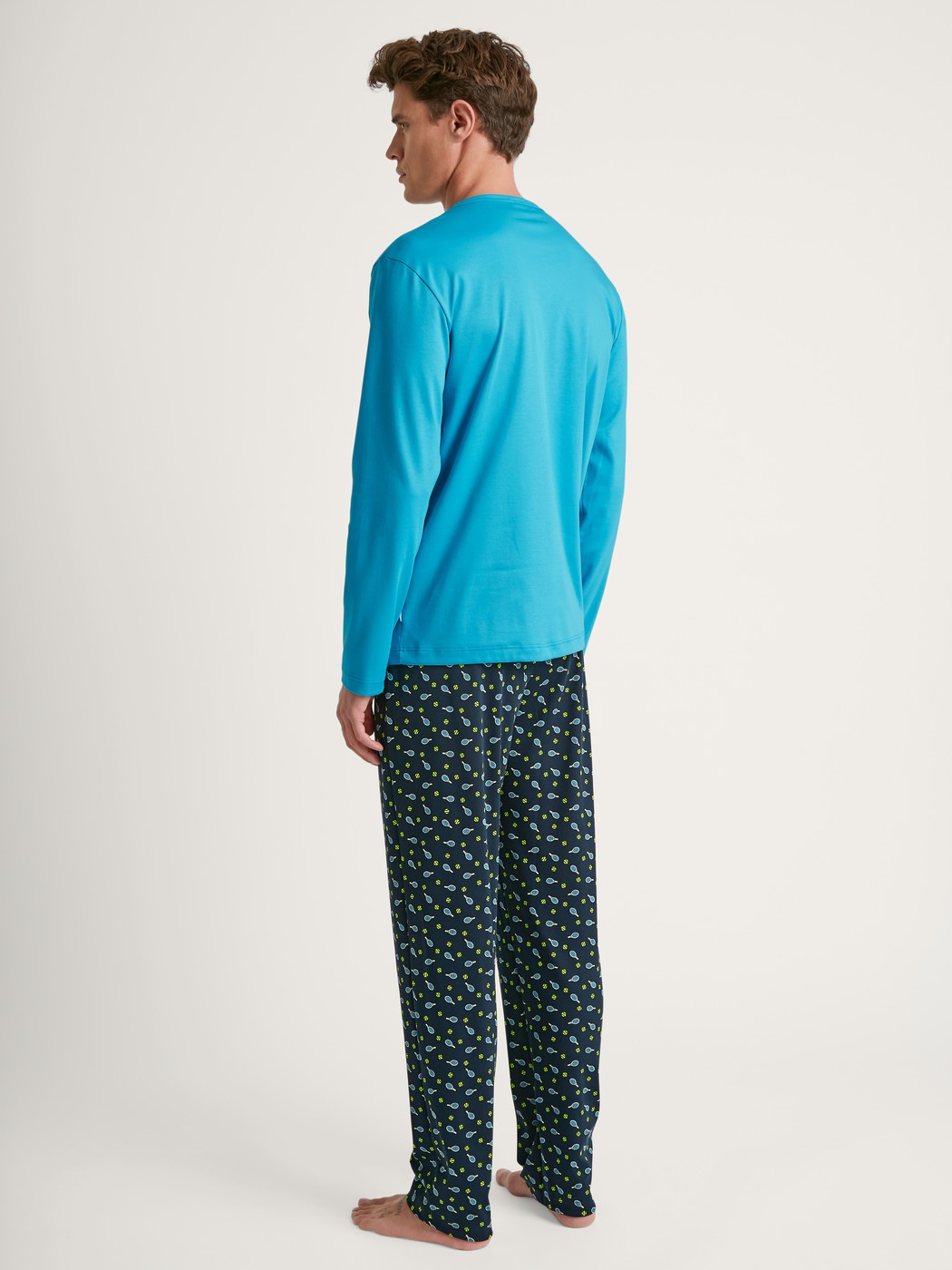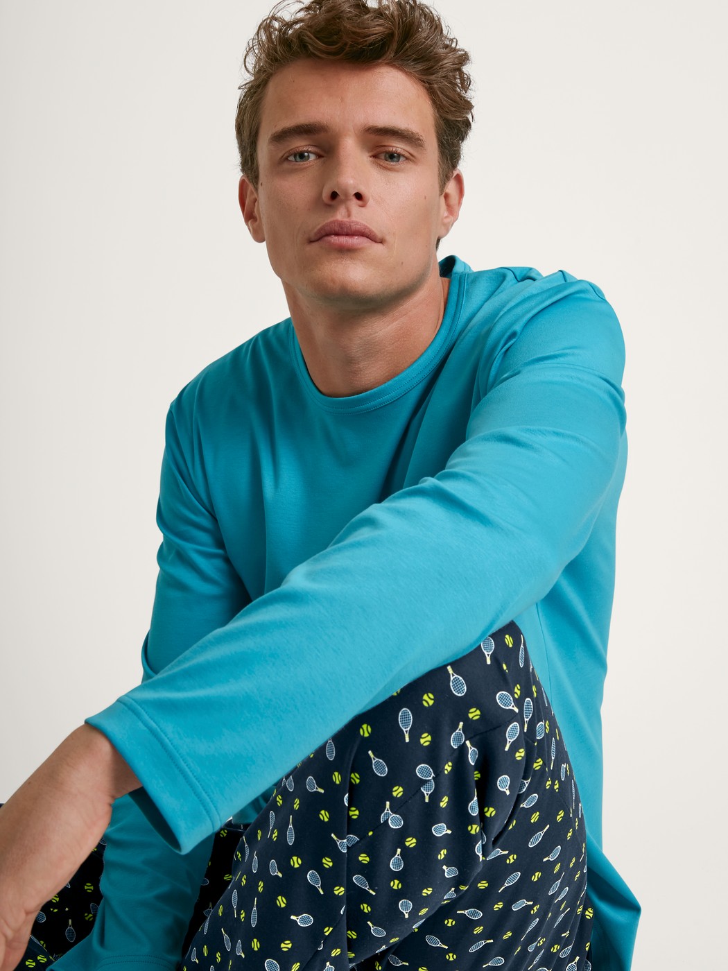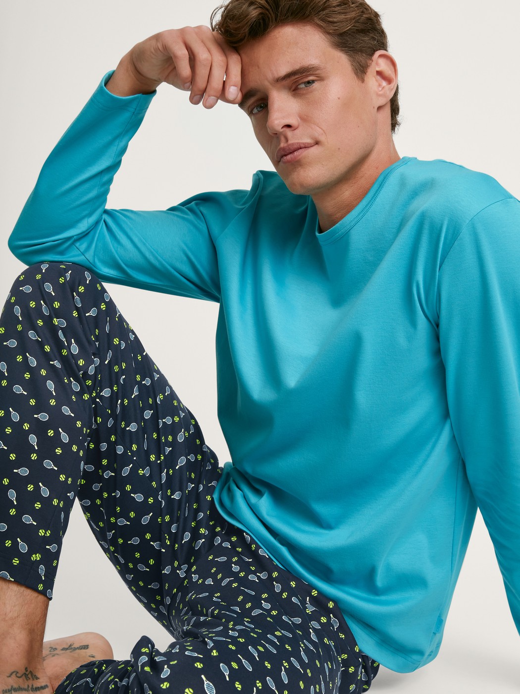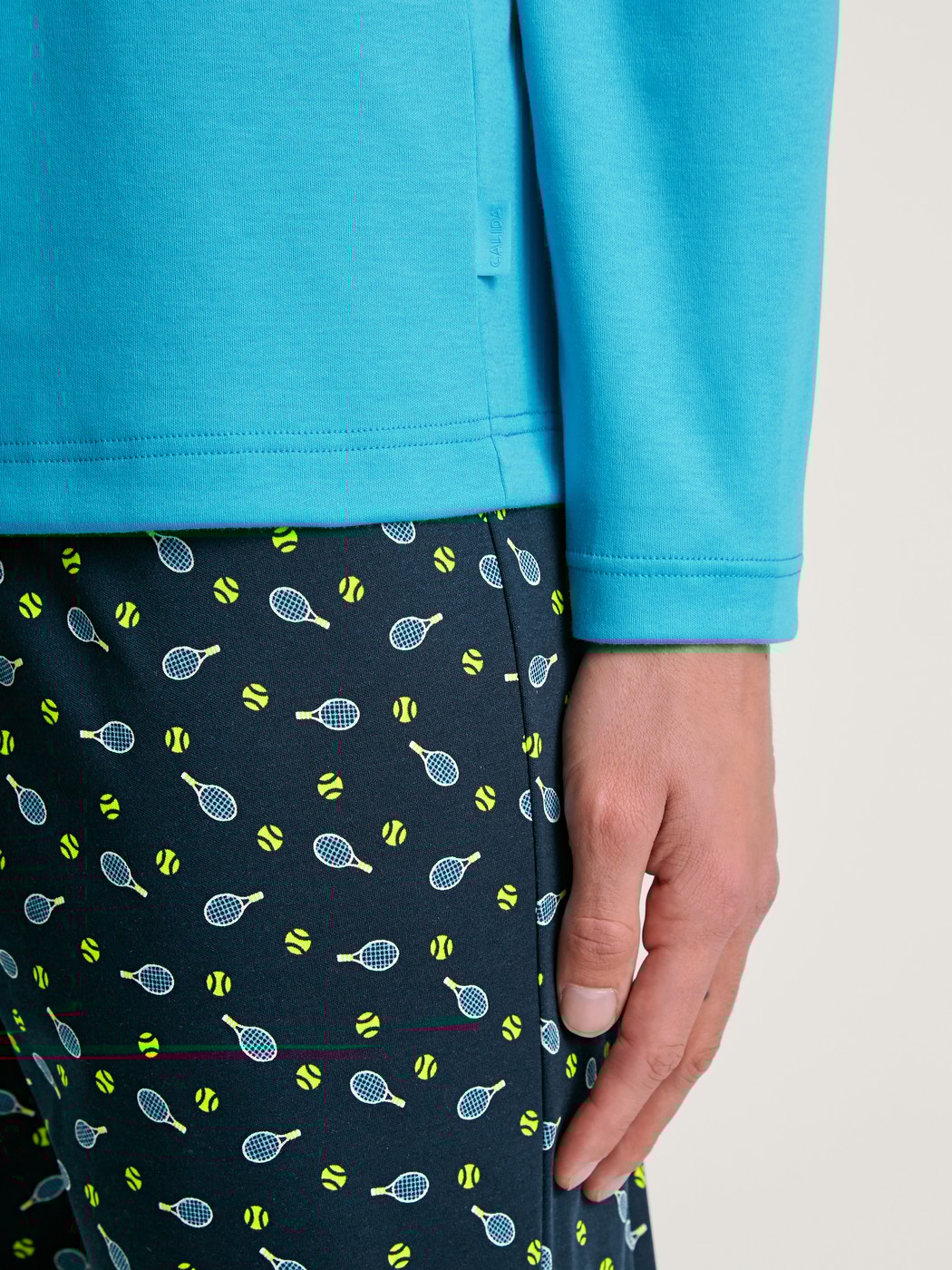 The set from the RELAX ENJOY series consists of pyjamas and cuffed pyjamas with an eye-catching striped pattern in bright blue, as well as further pyjamas and cuffed pyjamas in a sporty tennis print in dark sapphire with primrose yellow accents. The styles are made from high-quality cotton.