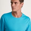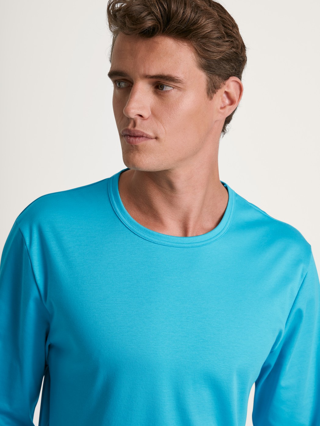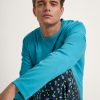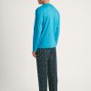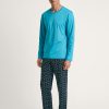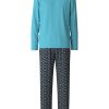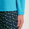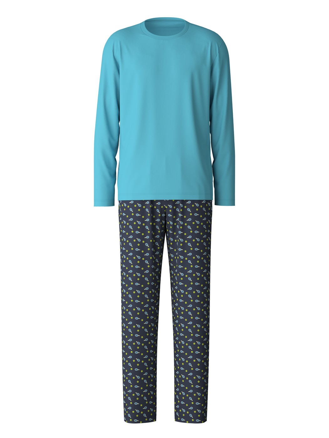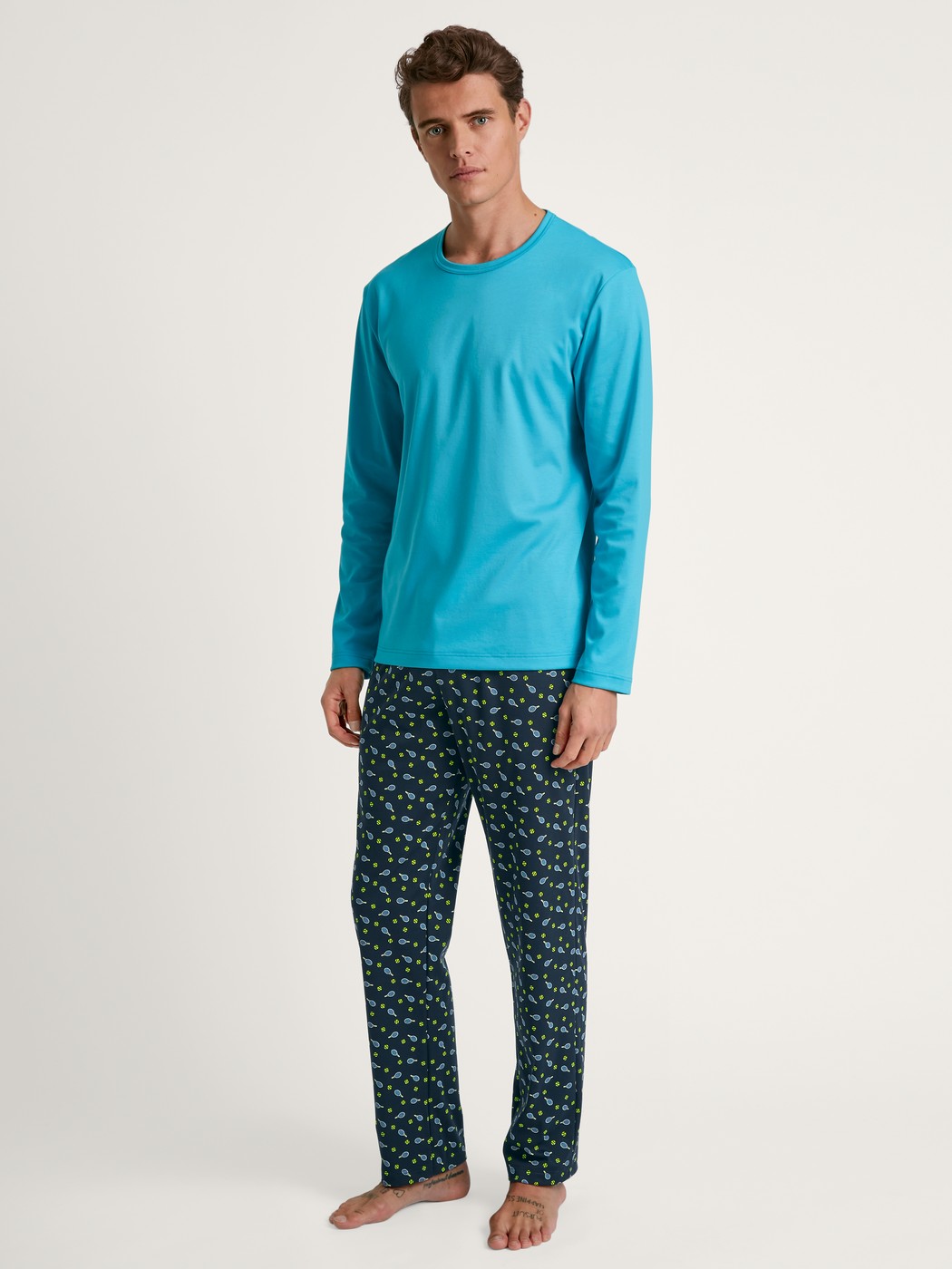 The set from the RELAX ENJOY series consists of pyjamas and cuffed pyjamas with an eye-catching striped pattern in bright blue, as well as further pyjamas and cuffed pyjamas in a sporty tennis print in dark sapphire with primrose yellow accents. The styles are made from high-quality cotton.