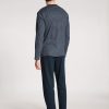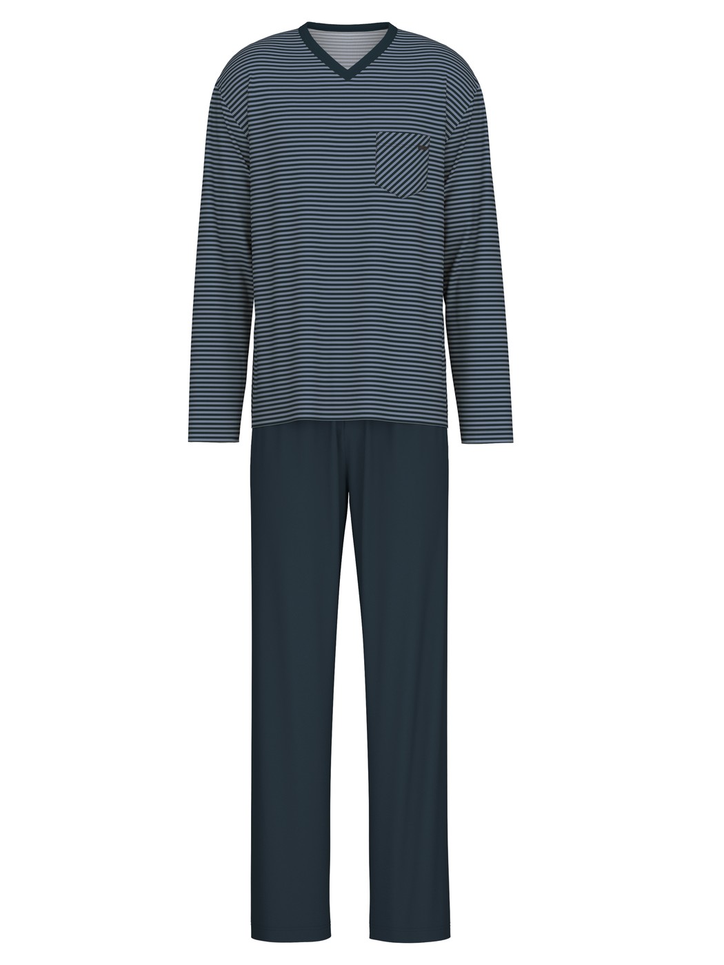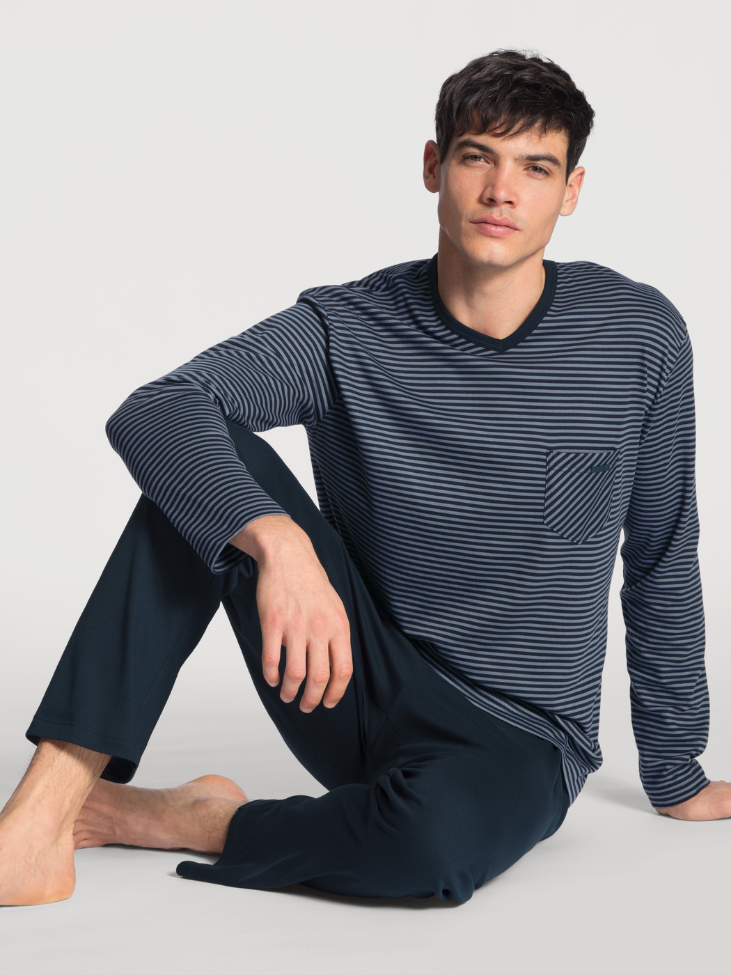 Long pyjamas made from comfortable and light interlock in classic colours by CALIDA. The combination of trendy striped top and super comfy colour block pants are also ideal as a relaxed leisure outfit. From the new RELAX STREAMLINE 2 series.