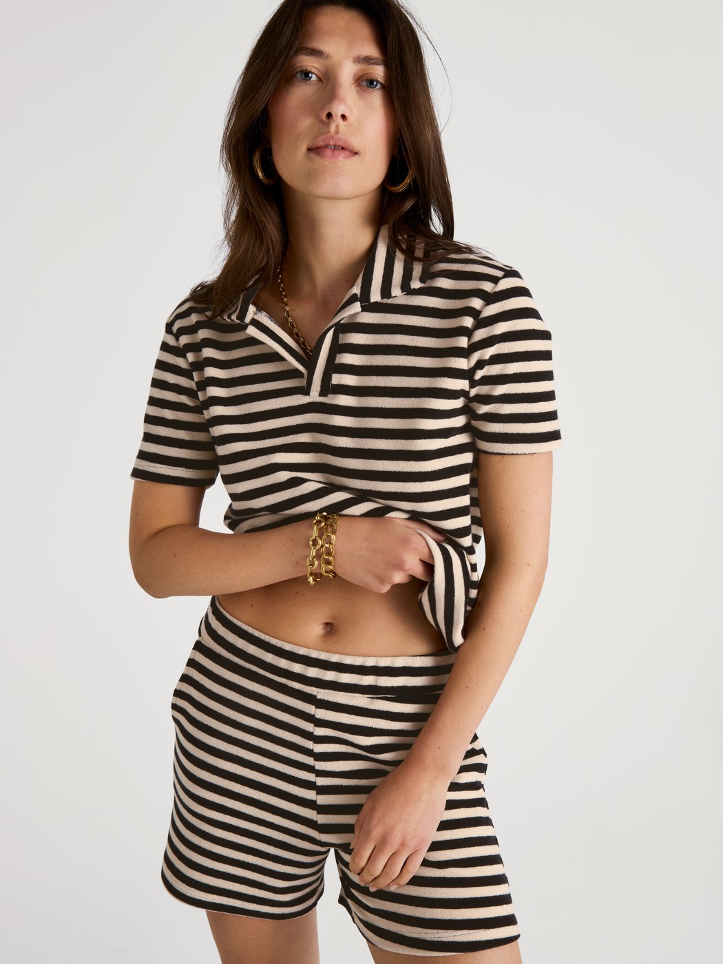 The LOUNGE STRIPES terry cloth line combines timeless comfort with all-round style. Consisting of a polo shirt, shorts and a bathrobe with a hood, the line features a black-and-white striped look that can be paired to create the perfect set for the home, the beach or casual streetwear. The cuddly terry cloth made from cotton and polyester is soft to the touch and highly absorbent – ideal for after a swim or for warm summer days. Thanks to the boxy, oversized cut, the styles can be worn by all genders and offer a relaxed fit that guarantees maximum comfort and freedom of movement.