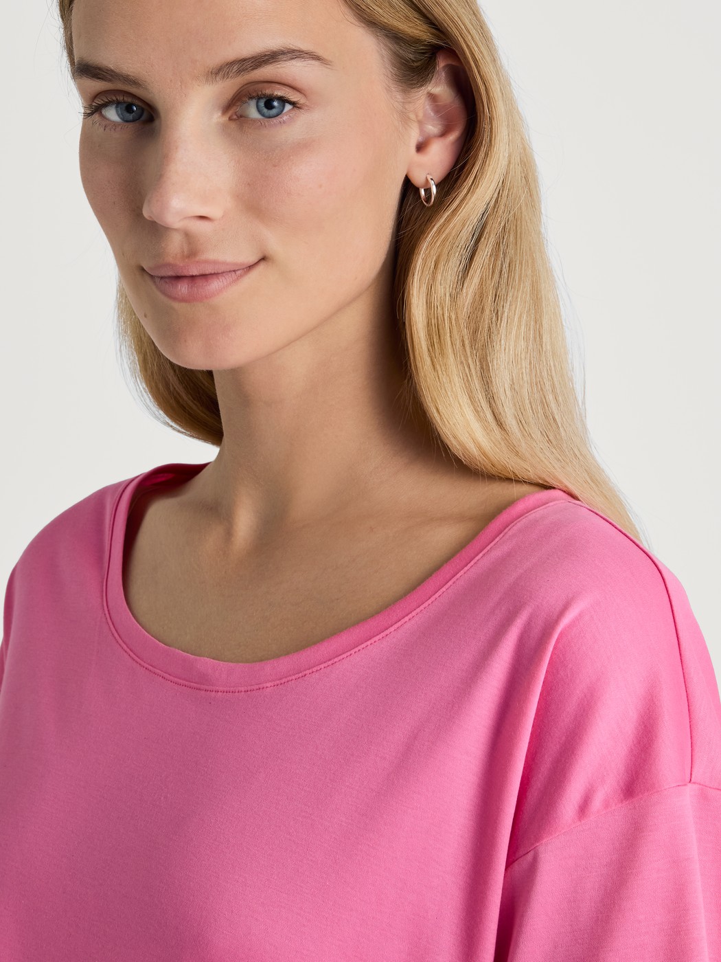 The FAVOURITES COAST mix & match range brings summer flair with an underwater world print in carnation pink on shorts, 7/8 trousers and a short-sleeved dress with a slight drape. The pieces are made from soft swiss+cotton/TENCEL™ modal superlight fabric, which ensures lightness and breathability. A retro parasol stripe print in ice green adorns a short-sleeved nightshirt and straight-cut trousers. Plain-coloured T-shirts, shorts with a lace hem and 7/8 trousers in a Vichy check pattern complete the collection and offer maximum versatility. The wide range of possible combinations creates light, summery favourite outfits.