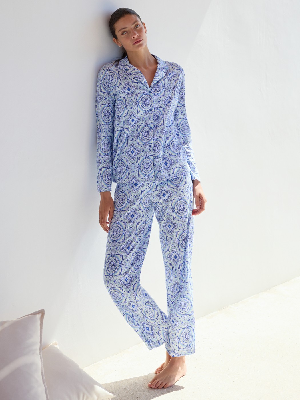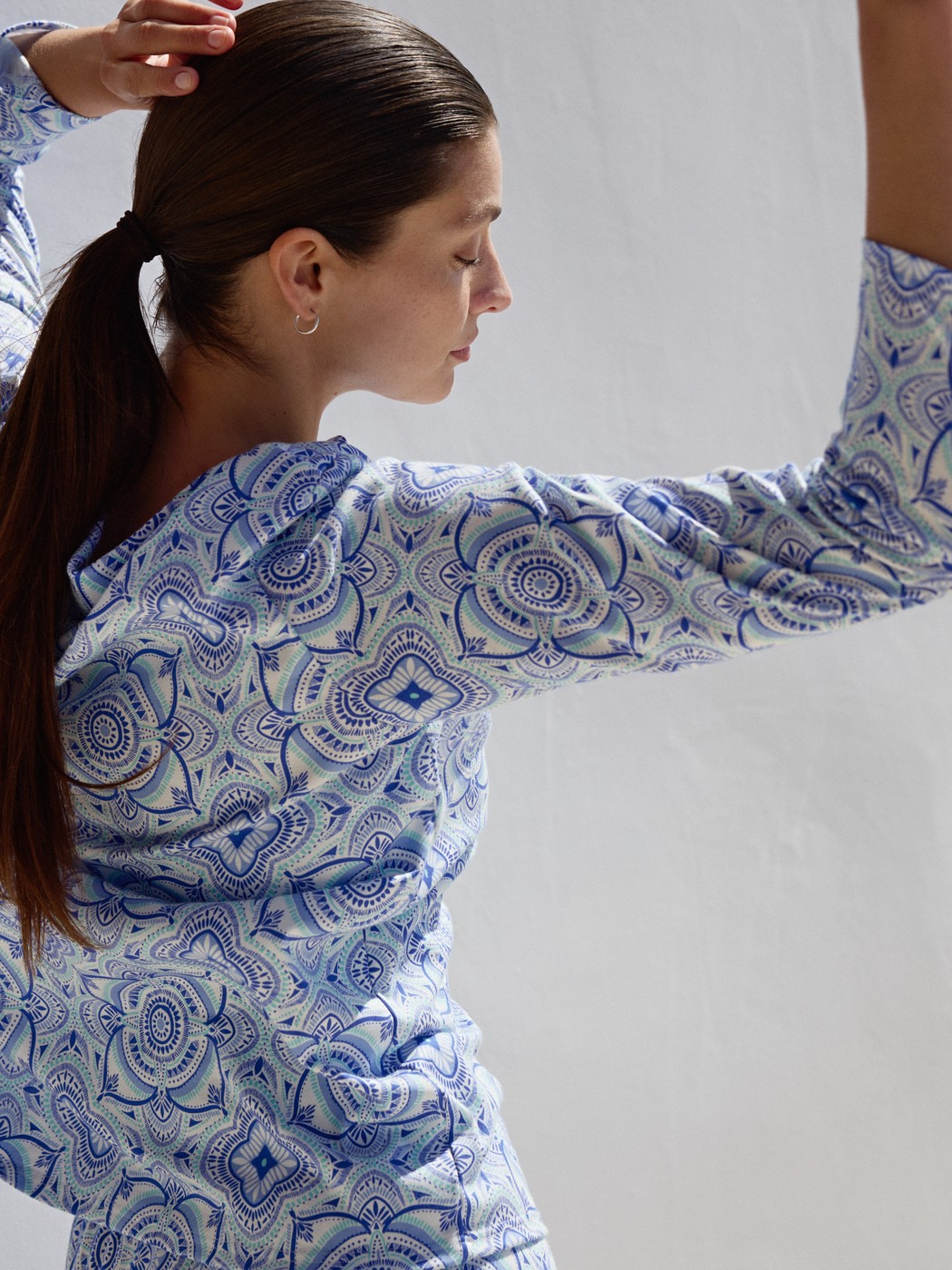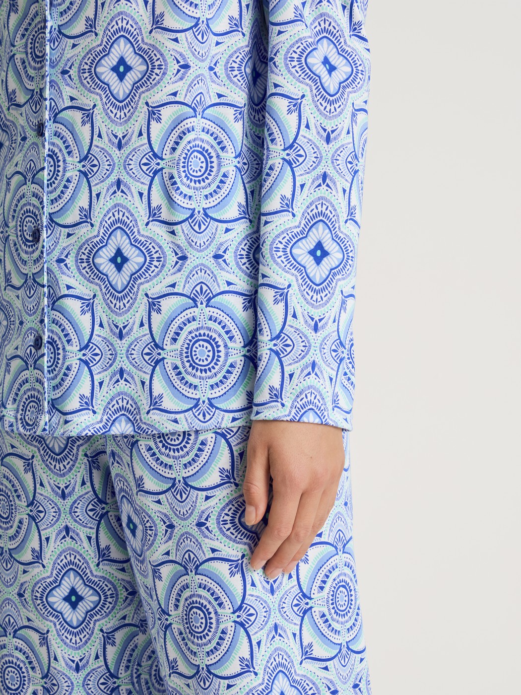 It’s almost a shame to only wear it in bed! Our ORIENT DREAMS sleepwear line in bright Dazzling Blue brings the charm of Greek art to the bedroom with its ornamental print. Made from high-quality SUPIMA® cotton, the pieces offer luxurious softness, high durability and brilliant colours. The modern cuts – like the buttoned pyjamas with palazzo pants, the airy nightshirt and the 7/8 pyjamas – are ideal for a relaxed night’s sleep and can be effortlessly integrated into your day-to-day. Classic pyjamas and cuffed pyjamas complete the collection.