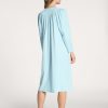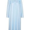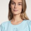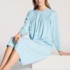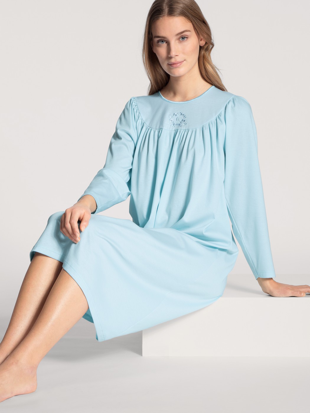 Feminine, classic long-sleeved nightshirt in a raglan cut made from cosy, softly flowing cotton interlock. The comfortable width for sleeping is achieved thanks to the beautifully lined up top yoke. A fine, shimmering satin ribbon adorns the neckline. An enchanting flower is embroidered in the centre of the yoke. 110 cm long.
