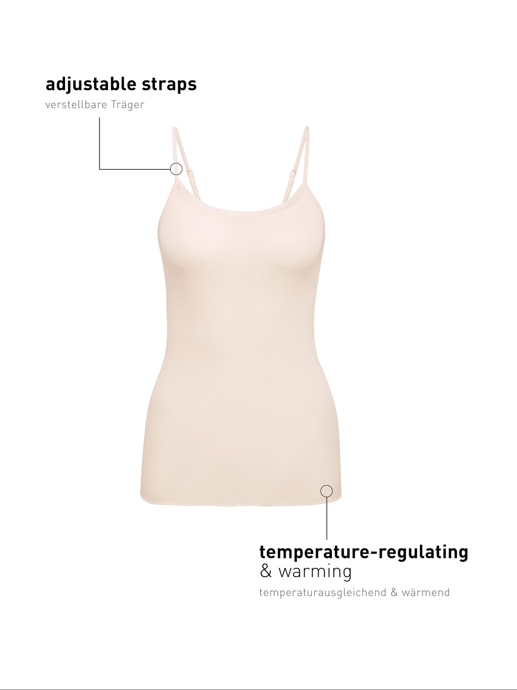 The spaghetti top from the TRUE CONFIDENCE line by CALIDA is extremely soft and gentle on even the most sensitive skin. Wool is good at absorbing moisture without feeling damp. This prevents the body temperature from dropping, while always giving a feeling of warmth and, above all, dryness. The bacteriostatic properties of the wool also prevent unwanted body odour.